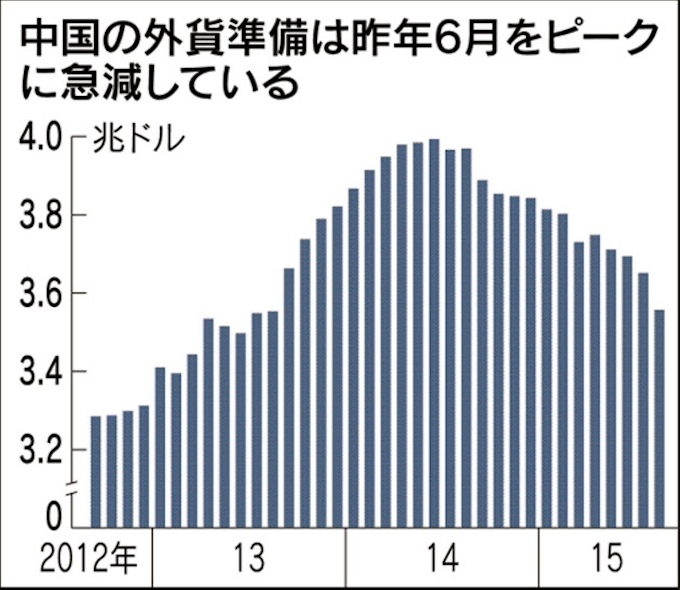 15年中国外貨準備高5127億ドル激減 1月末3 23兆ドルに