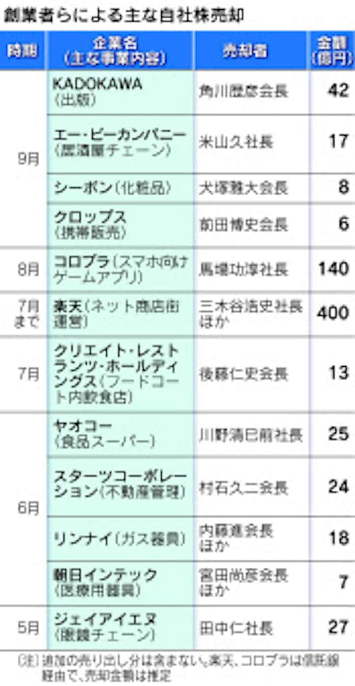 創業者 自社株売りに動く 税優遇廃止控え 日本経済新聞