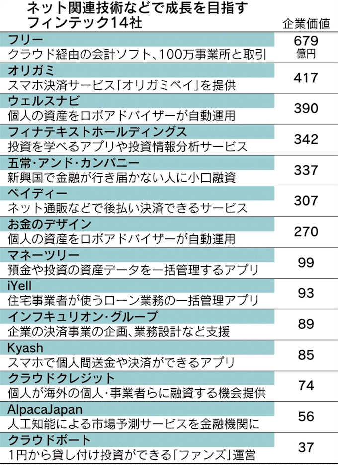 フィンテック 金融の空白補う 企業価値0億円超7社 日本経済新聞